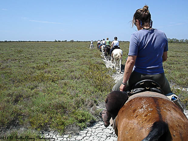 My friends and I reached the Camargue after a four-day long horseback ride from the Luberon Mountains to the flat salt marshes surrounding Saintes Maries de la Mer. The day had grown long and hot, and we were anxious to get back our land legs. We were riding in the heat of the summer, and the drought on the flat lands were clearly evident by the deep cracks in the dirt.