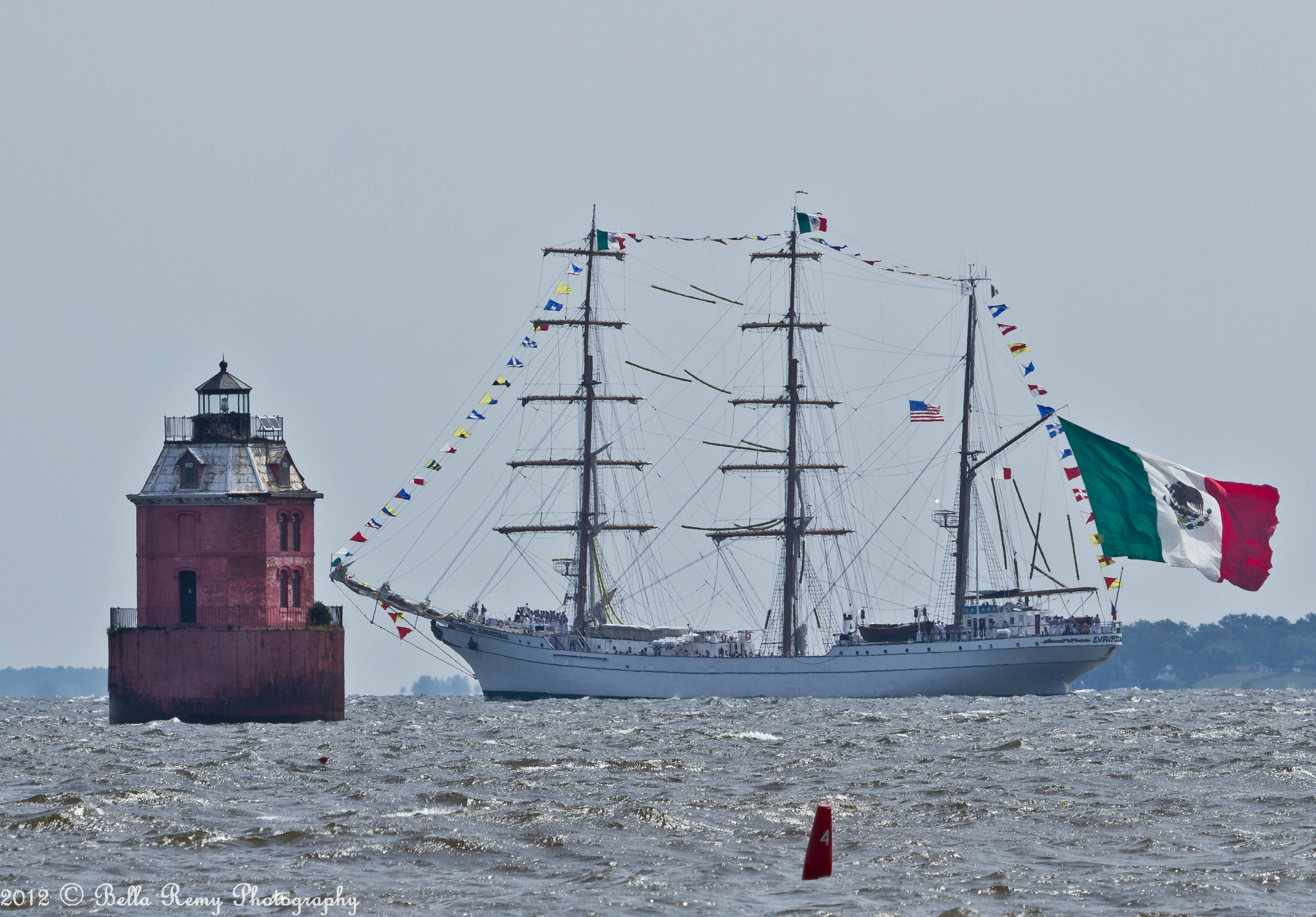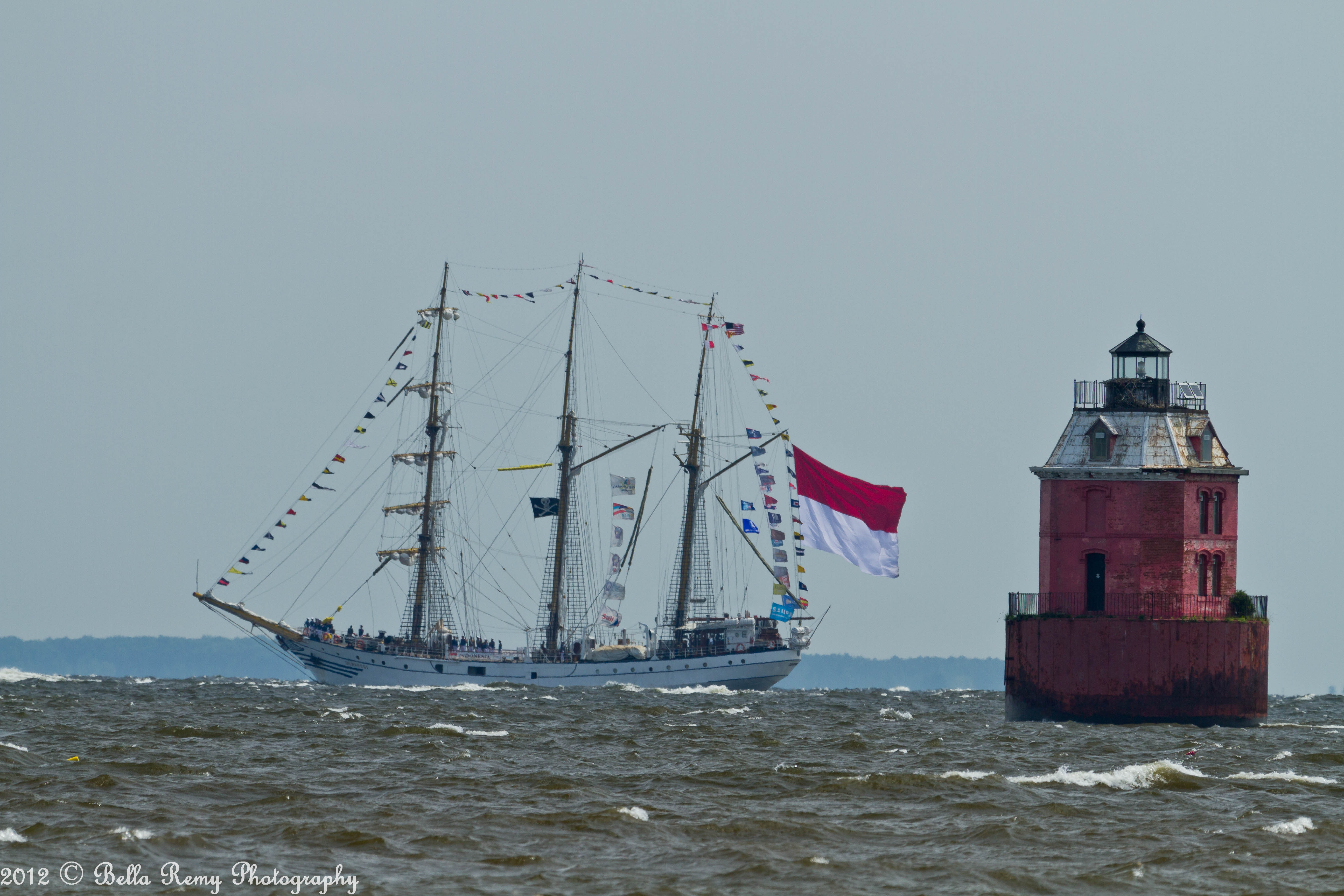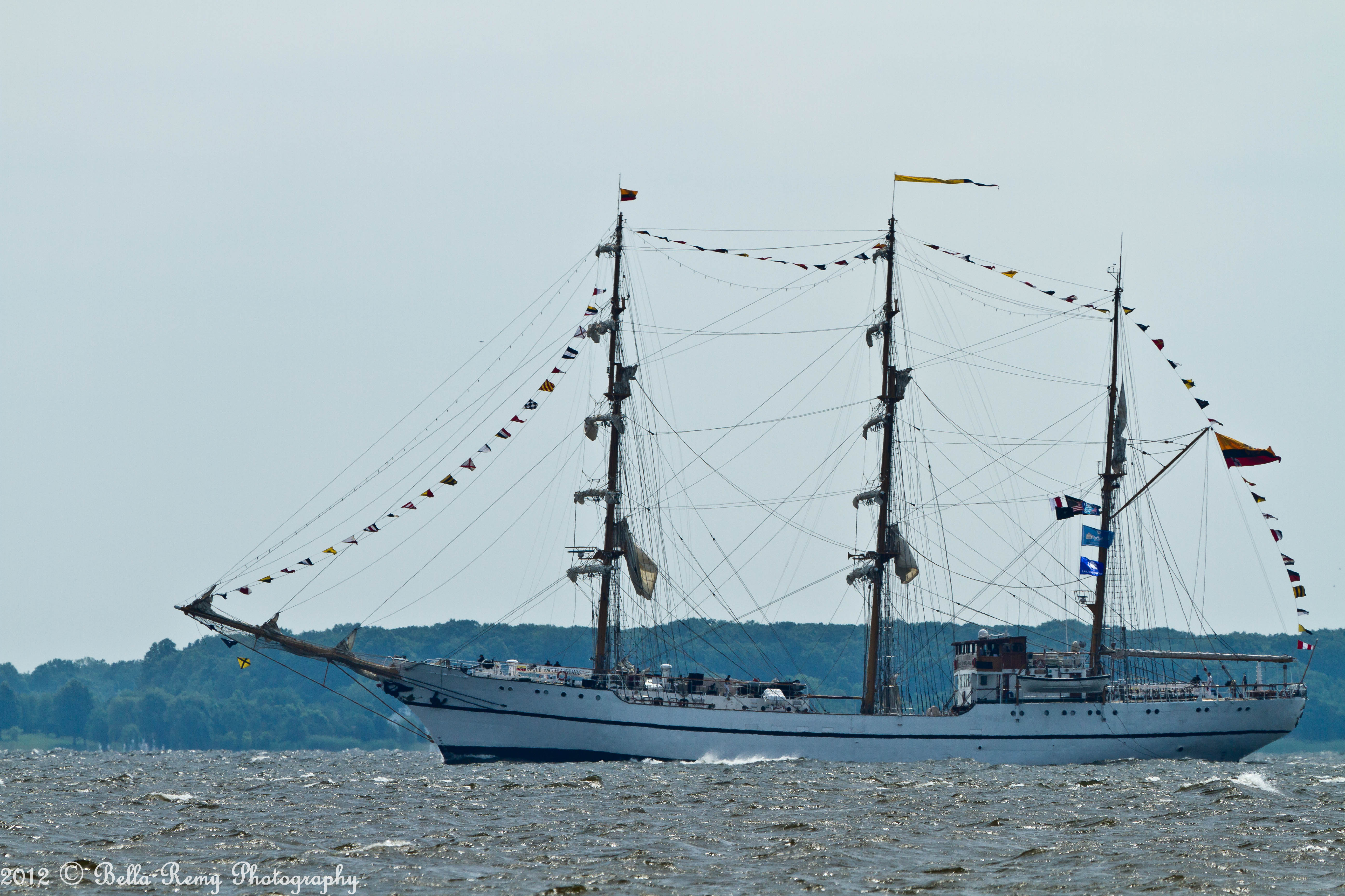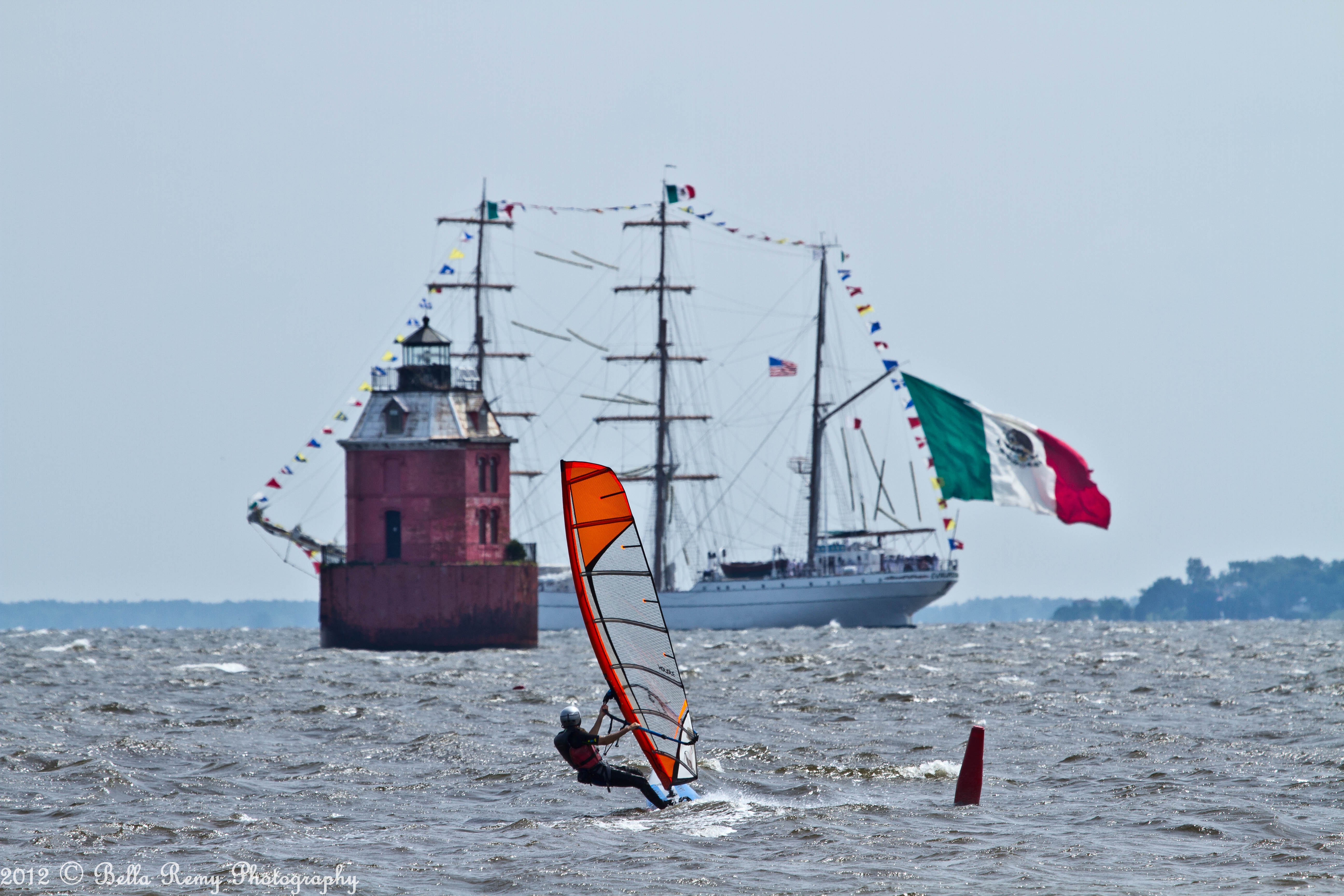 In hopes of capturing the Tall Ships arrival under sail, I planned on heading out to the Chesapeake Bay Bridge either by land or by sea this morning. A large rain storm passed by yesterday, which always results in high winds the following day. With an early departure, we got to the mouth of the Magothy River and were accosted by three to four foot white-capped swells. Quickly turning back, my friend and I jumped into a car and drove to Sandy Point Park in hopes to capture passing ships.