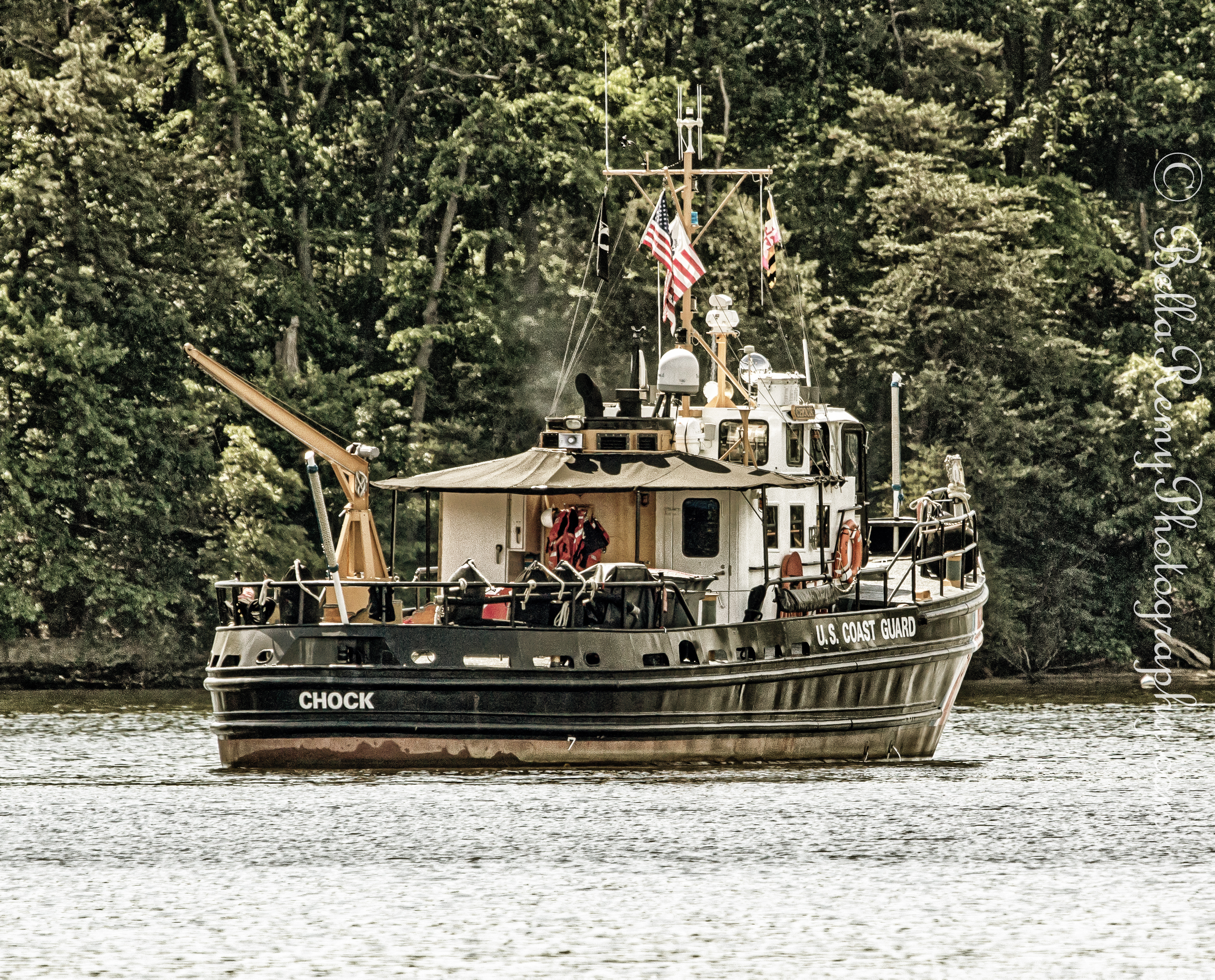 mm27may13-5017An unusual sight was seen on the Magothy River. Not only were the police busy policing the boat traffic for the Memorial Day holiday, this coast guard vessel was standing guard. Built in 1961 in Jacksonville, Florida, this ice breaking vessel named The chock is now stationed in Baltimore for law enforcement, safety patrols, and ice breaking.