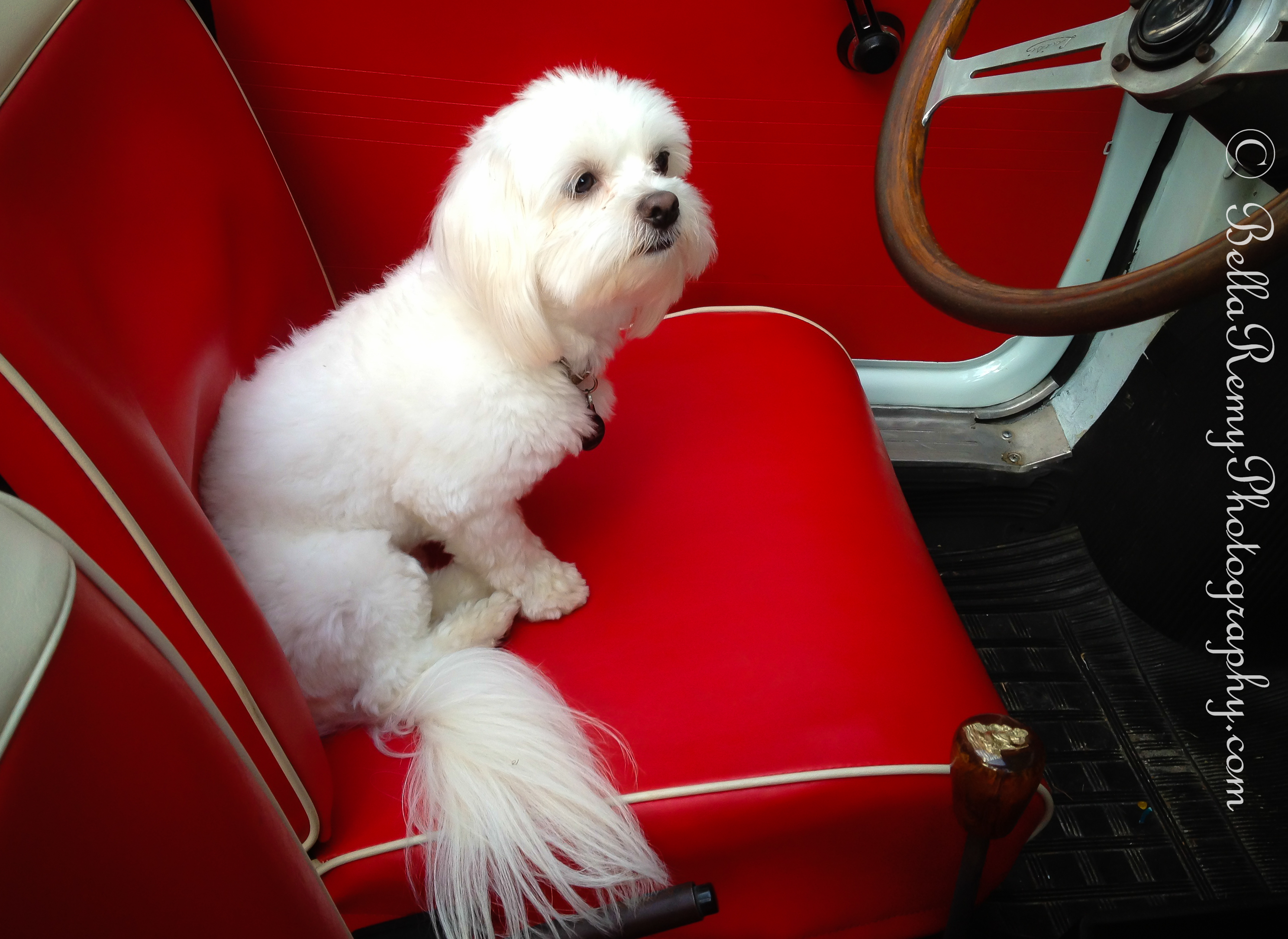 One of the riders has a classic fiat car and a perfectly adorable little dog. Waiting patiently for mom to return from the social, this lovely puppy perfectly matched the white Fiat and red interior.