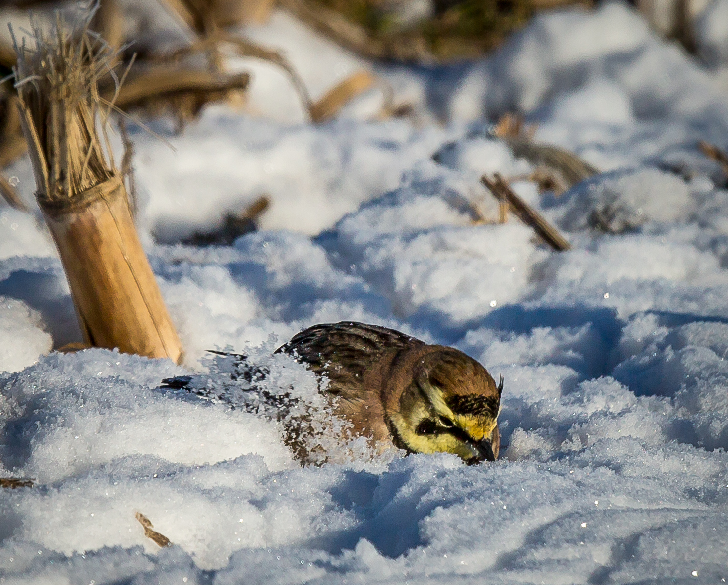 They would set themselves in the snow, burrowing in a small bird hole. They would then bury their heads in the snow, and fling the snow, looking for little bits of corn.