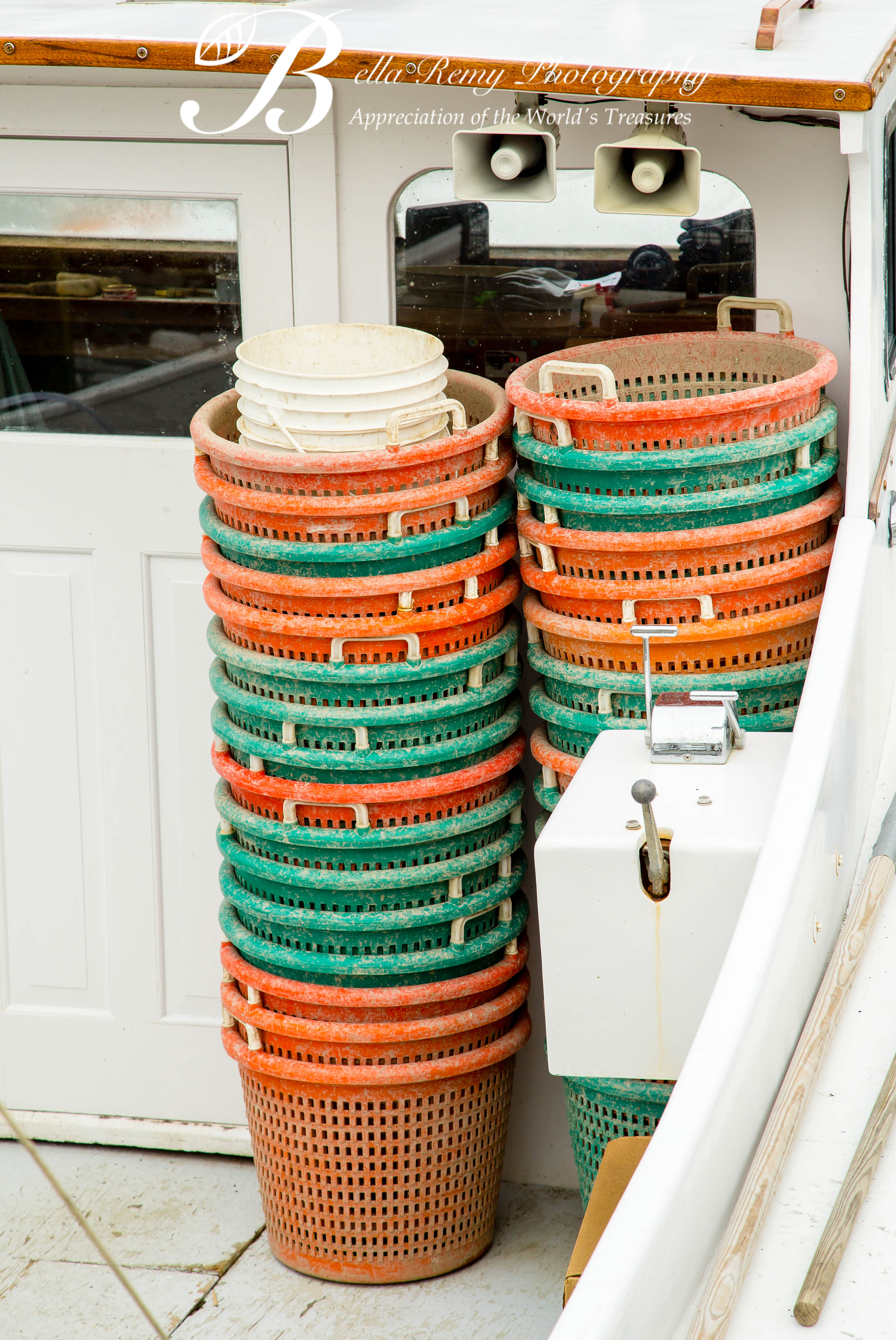 These boats, well weathered from the beating sun and harsh elements stood quiet awaiting for the ice to relent. The colorful baskets stacked, ready for the next outing to hold the bay’s crustacean treasures.