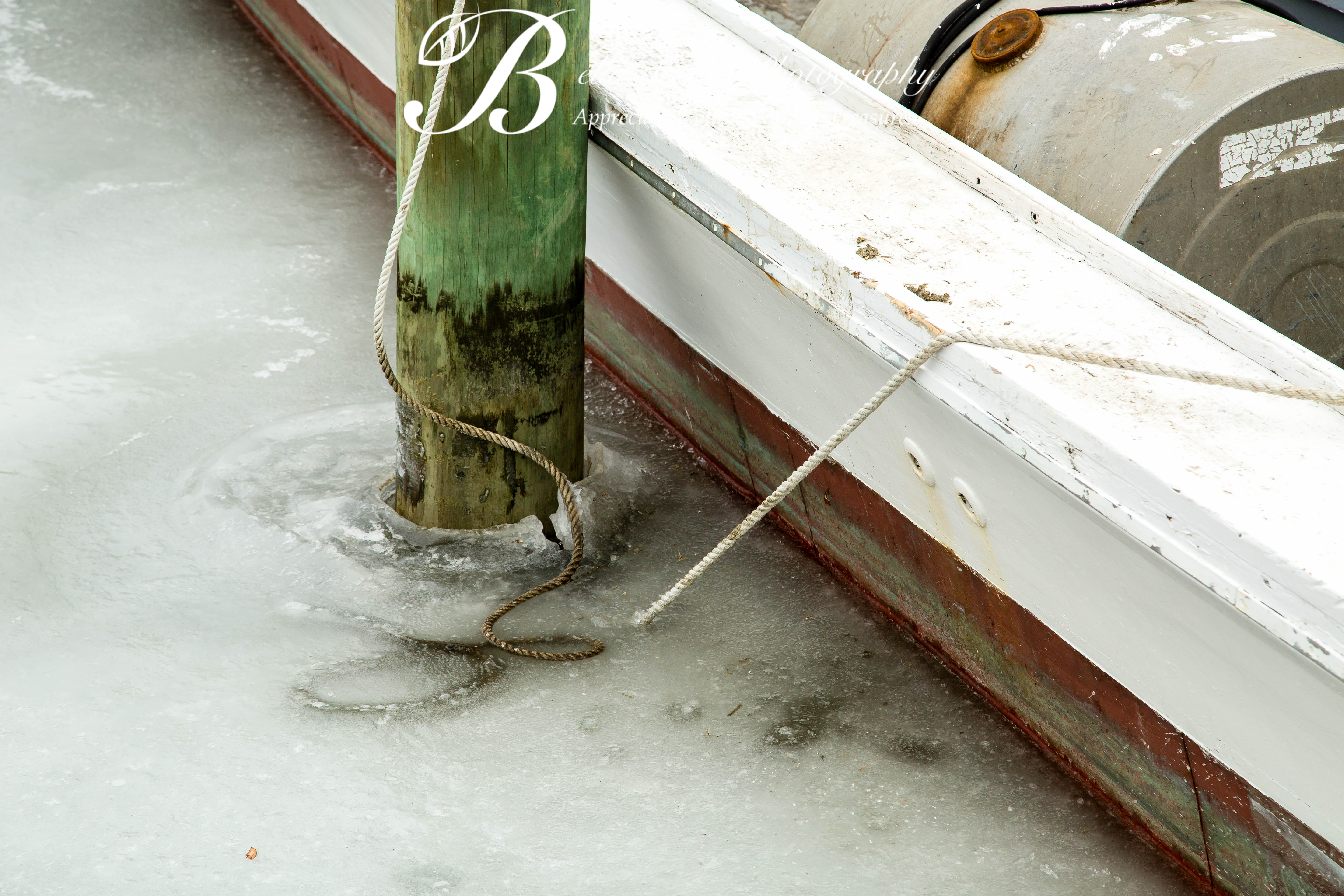 This winter has been an exceptionally cold winter. For the first time in 30 years, the bay was completely frozen over. Holding these water vessels captive, while moored along the dock.
