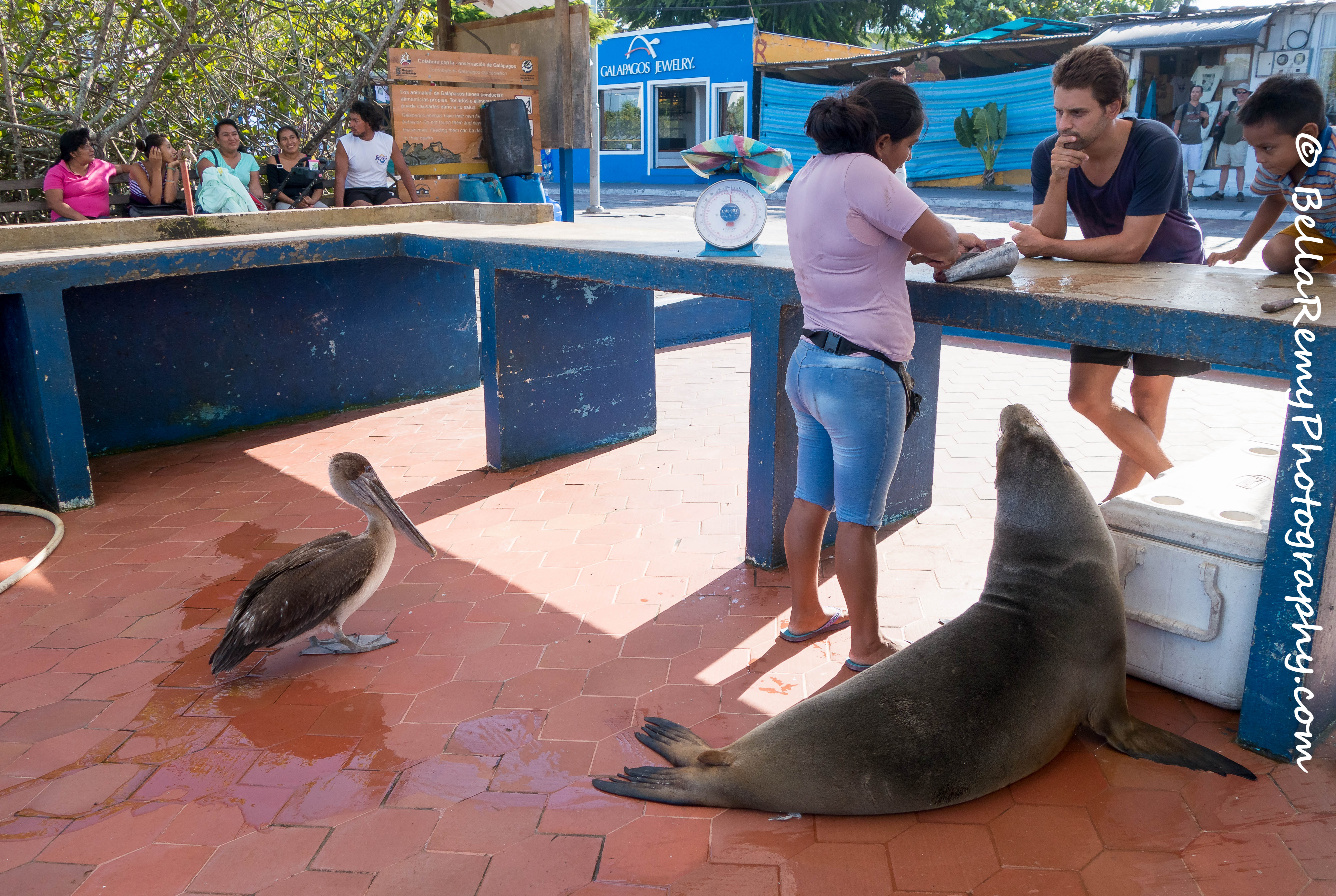 It wasn’t long before a customer came up to the cement table requesting a fresh portion of fish for the day’s meal. Awakening the senses of the Sea Lion and the Pelican, they hovered close hoping for some fish to land their way.