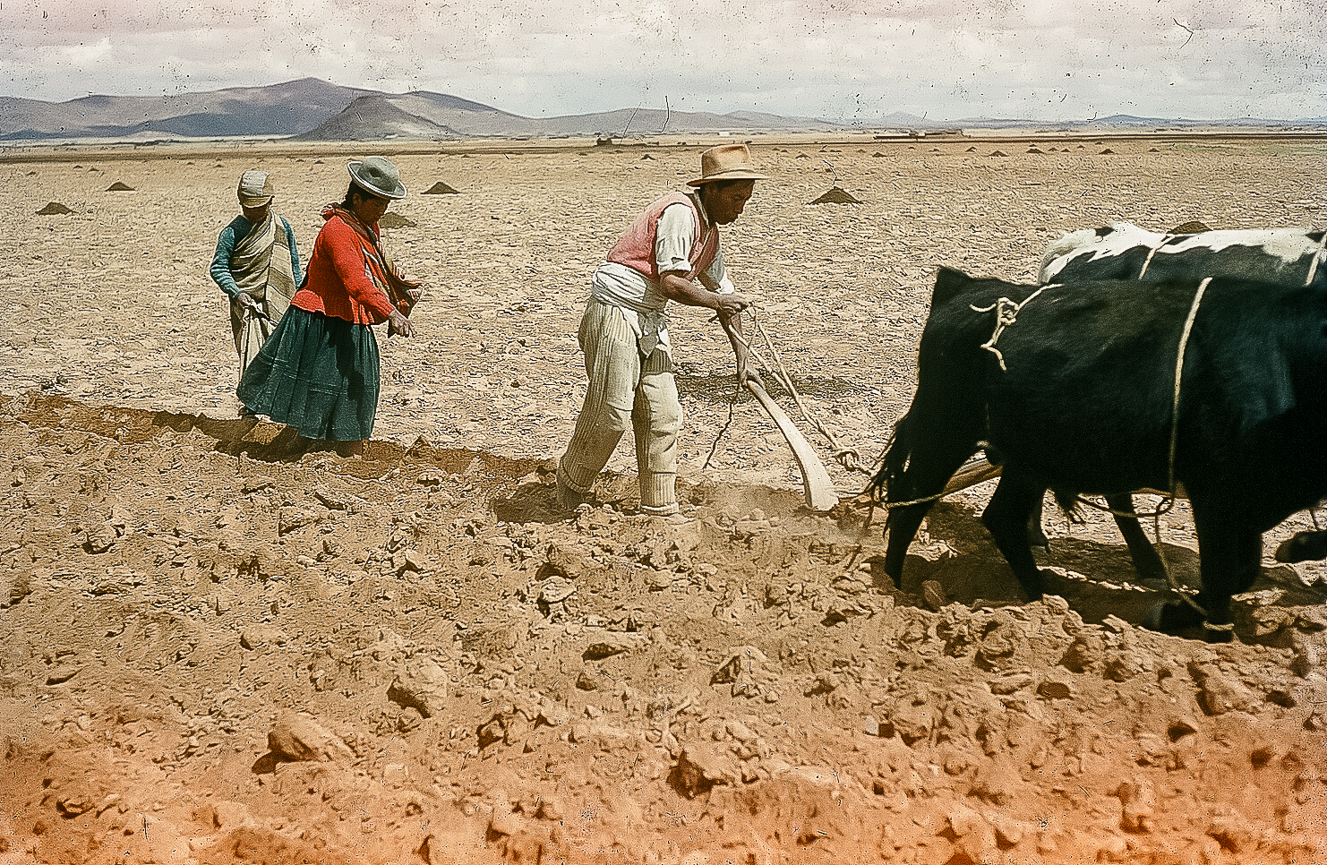 High in the Bolivian Altiplano region of the Andes Mountains, the Aymara Indians survive by farming the harsh, rocky terrain. Truly a family affair where all hands are used to till the tough soil and plant potatoes, corn and wheat for future harvest.