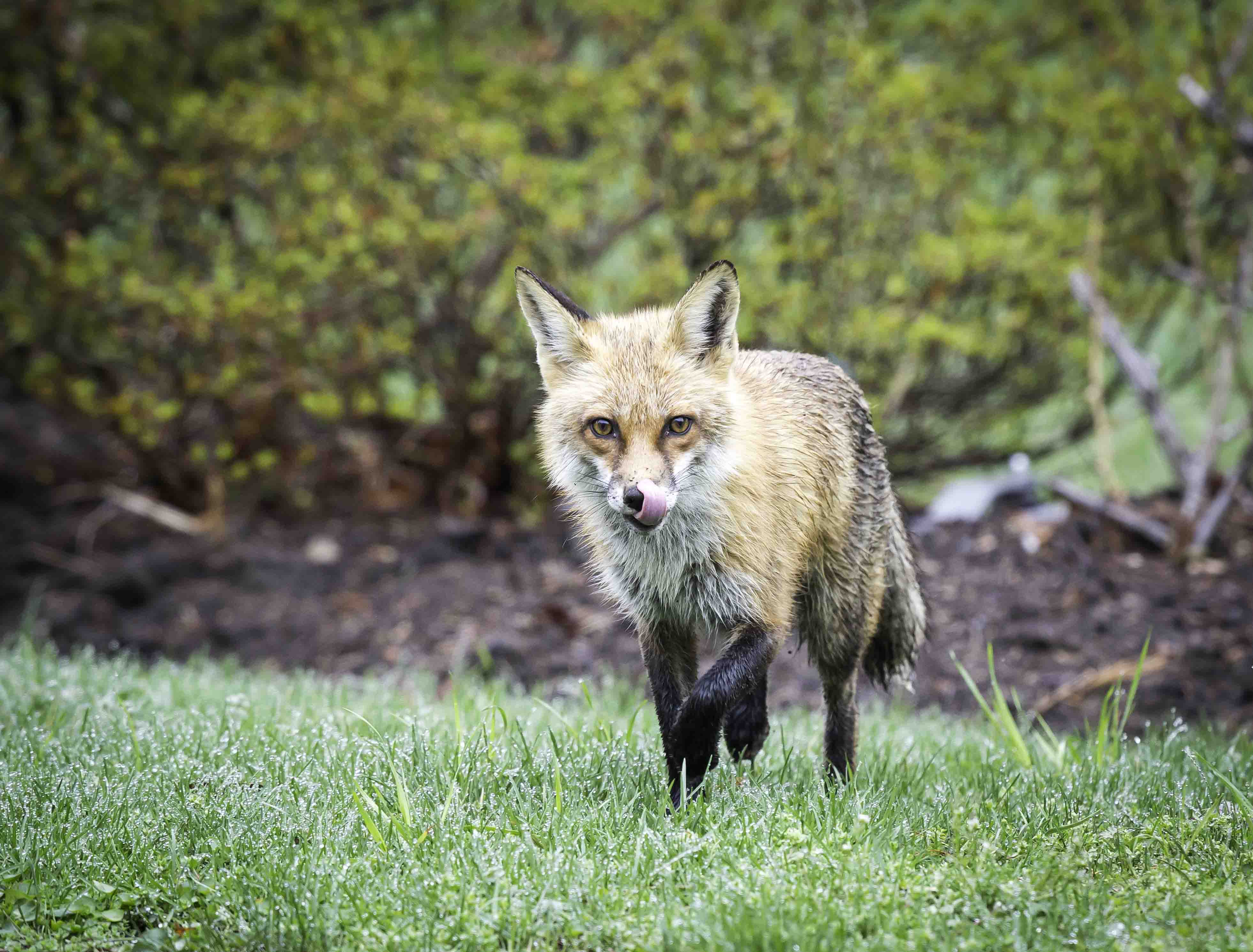 Back to the wet fox. Well, “Foxy” as she now recognizes me when I call her such, was running back and forth through the front drive way. Went that-a-way. Nope, no photo op. Ok, so let’s place some nice cut smoked turkey out for her to nibble on. Flew by the bowl without a glance to the neighbors.