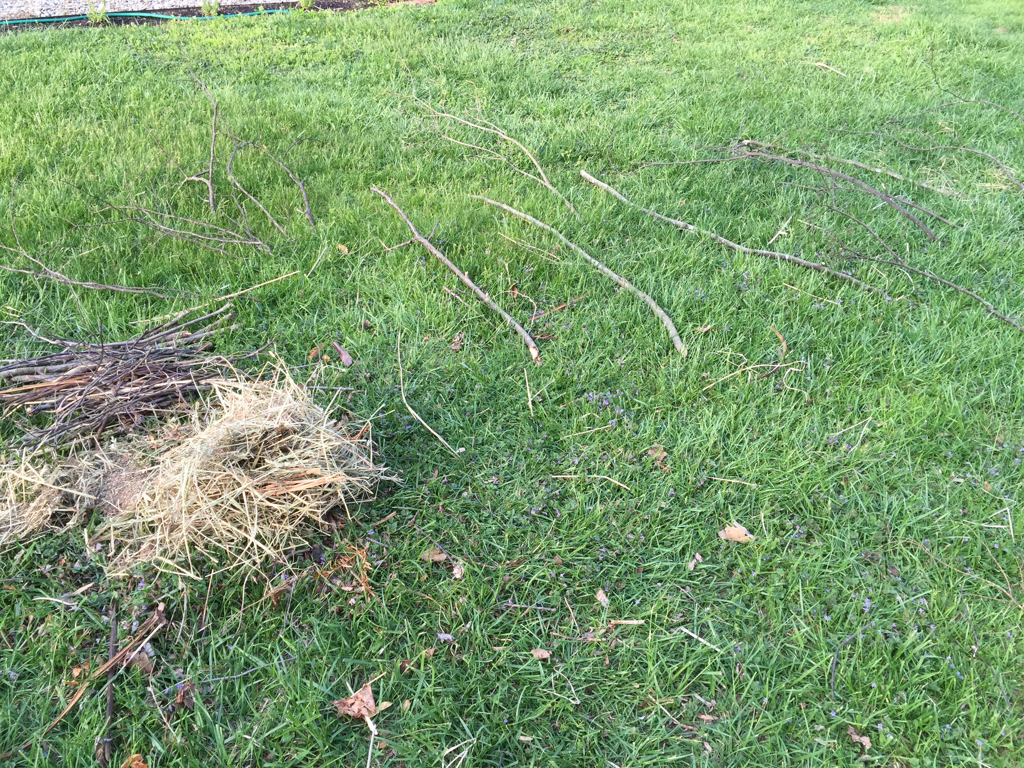 To help them with rebuilding their home, and hoping they would build on the new platform, I’ve been leaving gifts in the yard for Zorro’s use. What gifts? You may ask. Well, nesting materials for quick pick up.