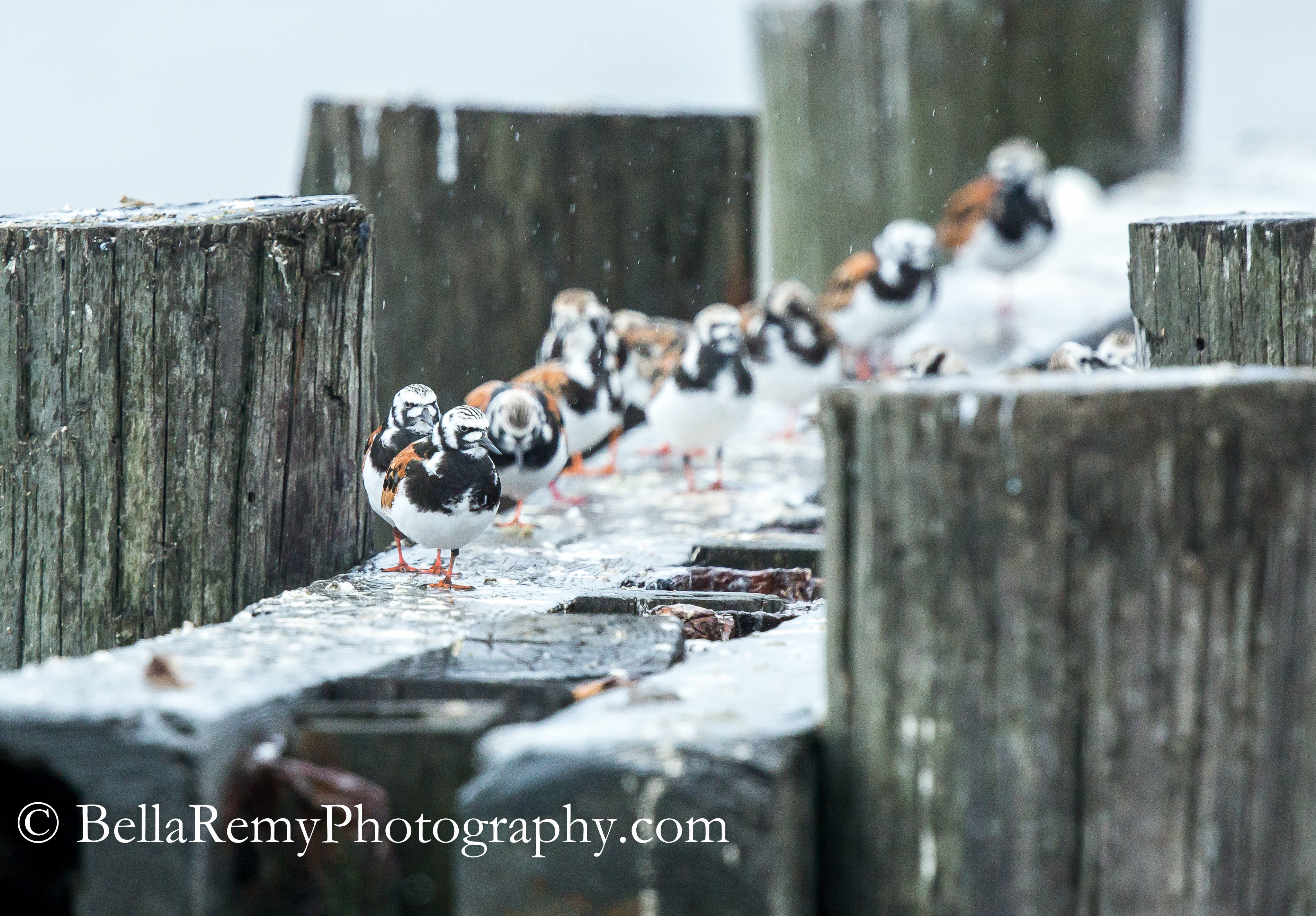 All lined up on the remnants of an old dock, these Ruddy Turnstones huddled in the light rain. Traveling through the Delaware shore in search of eggs from the Horseshoe Crabs.