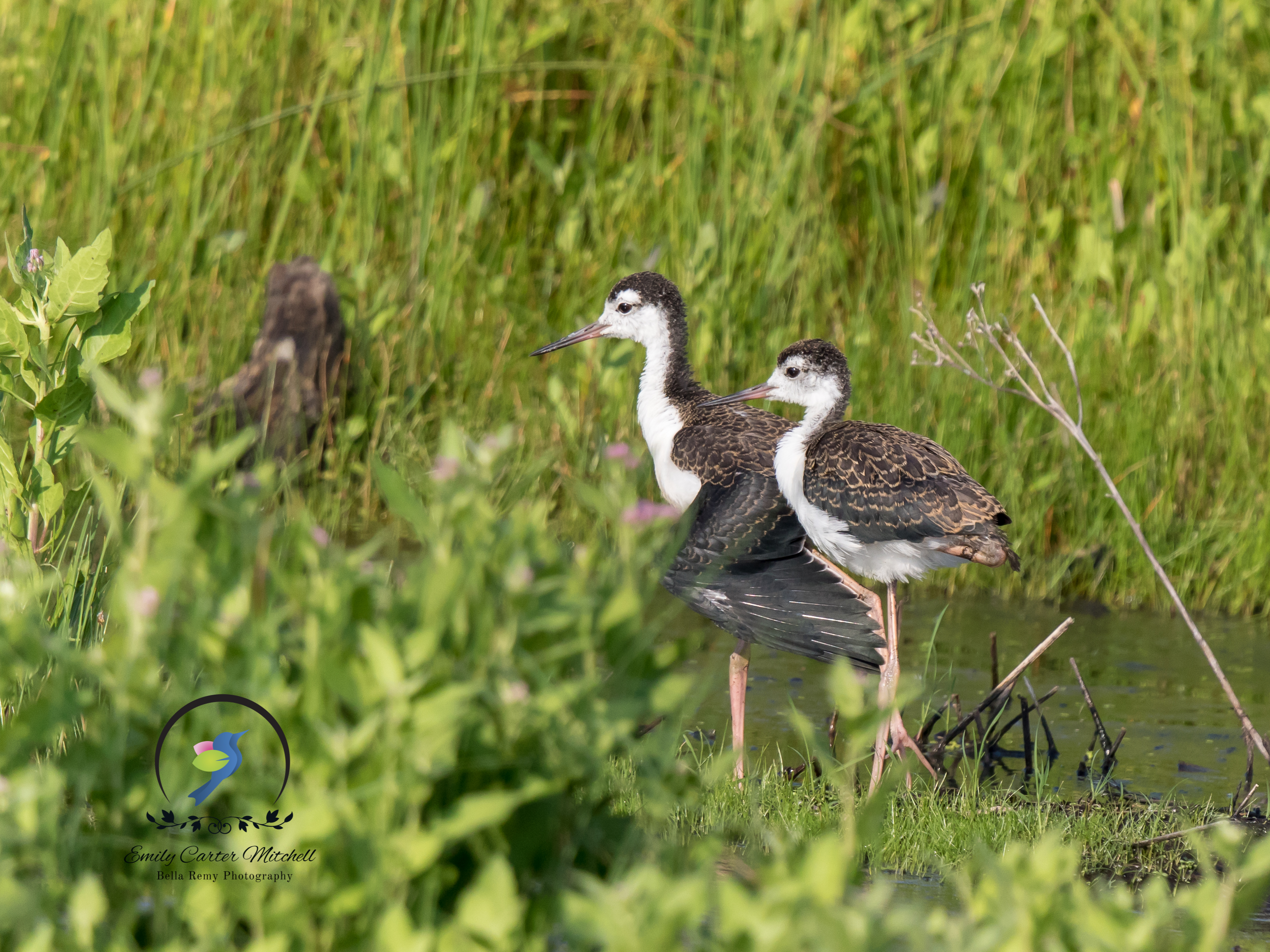 These Black necked Stilts, now teenagers were enjoying the cool water and stuck together like twins that they are. They were hiding behind some grass and I was waiting patiently for them to make their appearance, when a muskrat swam by with grass in his mouth. They rushed out from behind their hiding spot, with a look of confusion. A little stretch, and a deep breath, and they returned to strolling the marsh.