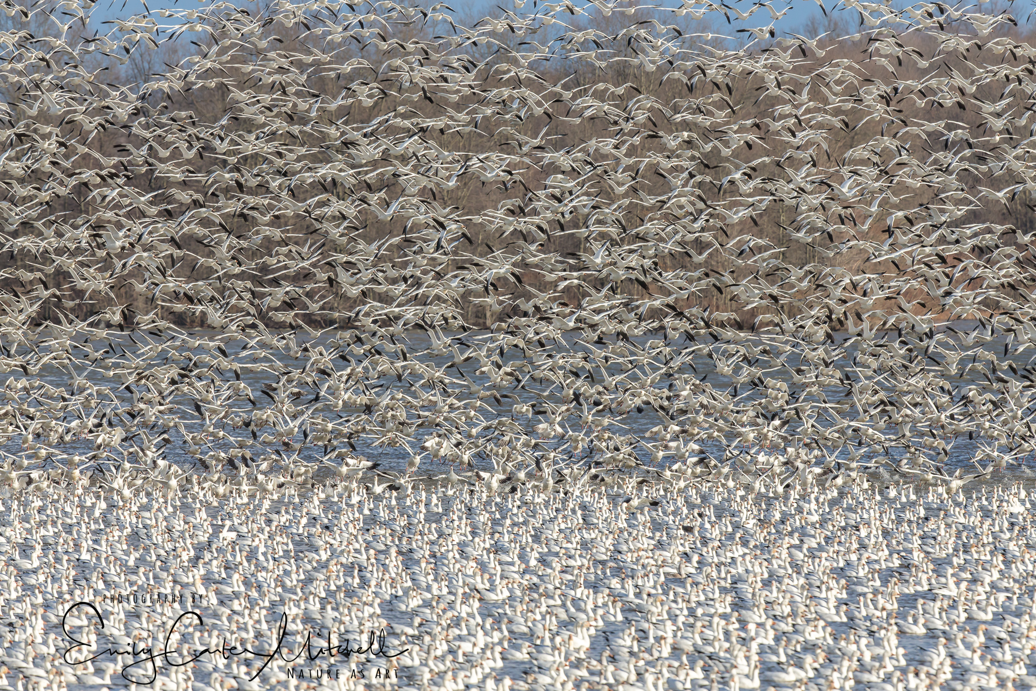 The geese spend the evenings on the lake roosting and during the days they fly out to the nearby corn fields to forage. With 70,000 geese the flock is in constant motion. Flowing along the water, and then randomly flushing up like a huge tidal wave, the sky filled with the thundering sounds of their flapping wings and the frame is filled with nothing but birds.