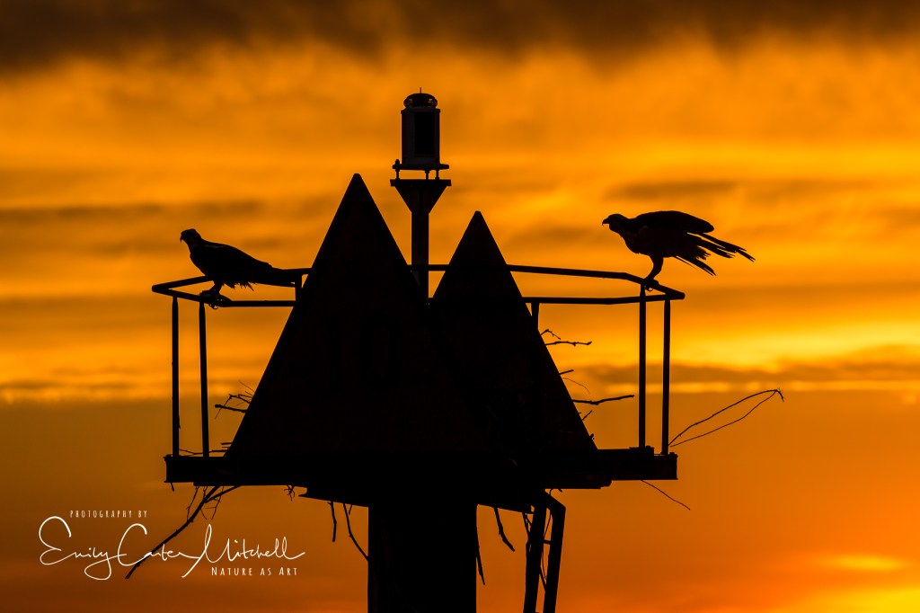 Using my Canon 5D Mark III with the Canon EF 100-400mm version II, I quickly went to work. With the one-foot water chop, and the boat movement, I stood up to help me get a steady shot. Using continuous focus and high continuous shooting I planned on making the Ospreys a silhouette in the sunset. Using Manual mode, I selected a high shutter speed of 1/1600 of a second, at f/8 and ISO 800. I’ve also learned that using Shade white balance really brings out the richness in a sunset or sunrise.