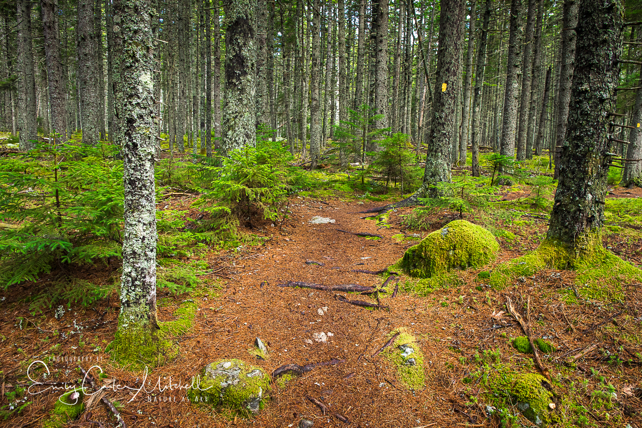 The scent of balsam fir, and the flute sounds of the Swainson’s thrush grace my footsteps as I walk down the trail in Indian Point Blagden Preserve on Mount Desert Island, Maine.