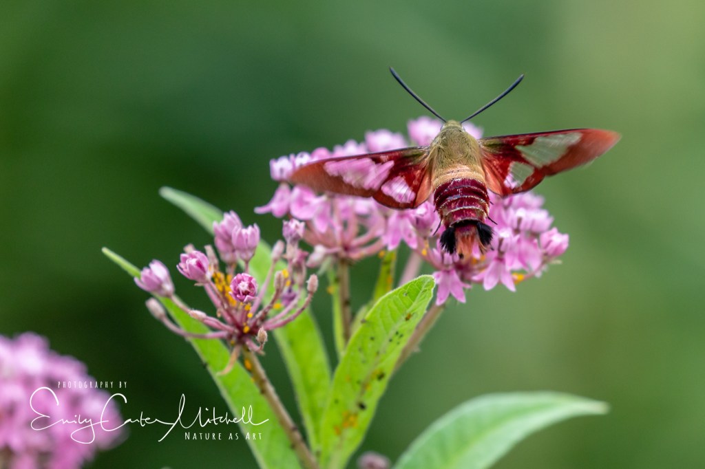 Yesterday I had the privilege of seeing some rather unusual things not seen before. The Clear winged hummingbird moths have come out in full force, along with the native butterflies and seeing them enjoy pollinator plants at a nearby wildlife refuge was a true pleasure. Using a telephoto lens, I’m able to capture them without scaring them off.